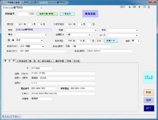 入学願書の内容を受験番号から入力します、既に入力した受験番号は修正モードとなり内容を変更できます。