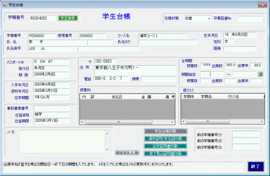 登録済みの学生について学籍番号を指定(または検索ボタンで学生を検索)して学生台帳を表示します。