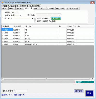 氏名、住所、電話、クラス、コース、入学/卒業日付、進路、授業料期限遅れの項目を指定して学生の検索が出来ます。