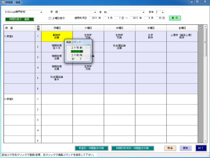 時間割登録画面で、コマを右クリックすると編集コマンド画面を表示、移動/交換/削除を実行できます。