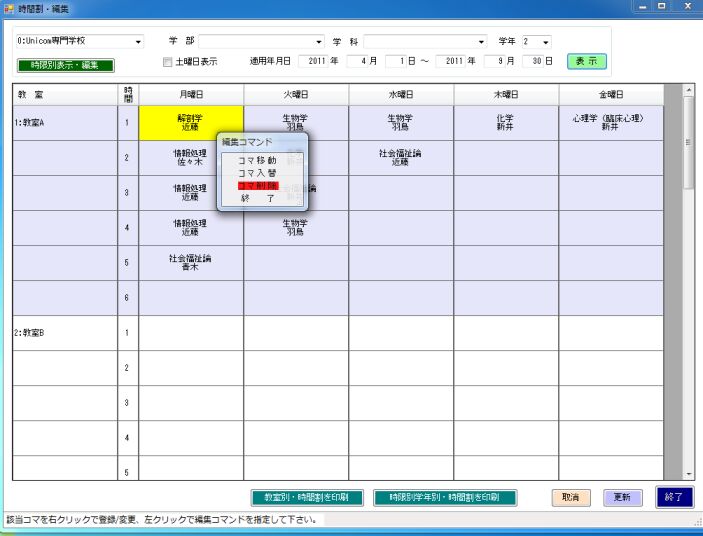 時間割登録画面で、コマを右クリックすると編集コマンド画面を表示、移動/交換/削除を実行できます。