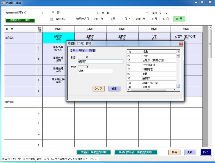 時間割登録画面で、コマを左クリックすると詳細画面で科目、教師を登録できます。