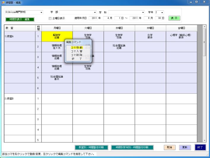 時間割登録画面で、コマを右クリックすると編集コマンド画面を表示、移動/交換/削除を実行できます。
